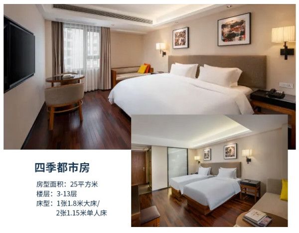 酒店拥有舒适的客房,房内配有“KINGKOIL 金可儿 ”床垫,健康舒适的睡眠体验;卫生间的热带雨林花洒及充足水压,享受酣畅淋浴;客房配有迷你吧饮品,胶囊咖啡机,专享纯正意式咖啡。君亭酒店的2楼四季餐厅,供应丰盛的自助早餐,健康,绿色,一天能量的开始。14楼自助健身房/儿童乐园/自助洗衣房等设施配套齐全。
