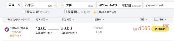 现有河北航空石家庄飞日本大阪单程次卡,价格为200元/人,预约有效期为4.1-4.30 23:40,可预约航班4.5-6.30(4.30、5.2、5.30这三日不适用),套餐不含税费,需另付。不约/过期退。