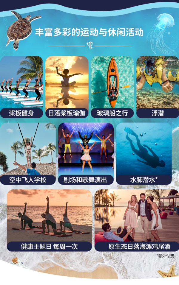 住在翡诺岛度假村的住客,可以在自己岛上的餐厅享受每日不限量供应香槟、特调鸡尾酒及主厨设计的各种创意料理。也可以去隔壁的Club Med卡尼岛享受不一样的风味,总共两个岛上4家餐厅,7家酒吧,可以打卡体验。 CM在马代上的岛比起其它岛来说,除了基本的餐食全含会多很多的活动,比如桨板健身、日落瑜伽、玻璃船、独木舟、帆船等,通通都是免费的。
