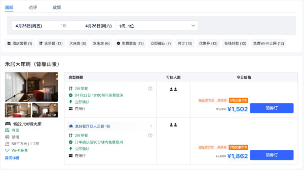 携程现有台州天台禾酒店 台州禾居大床房(背靠山景)2晚连住套餐,含双早+迷你吧+高铁站接送服务,价格为1299元。套餐可使用至2025年6月30日,3-4月不加价,5-6月有100元/间/晚的补差,清明/五一/端午不可用,不约/约不上可退款。