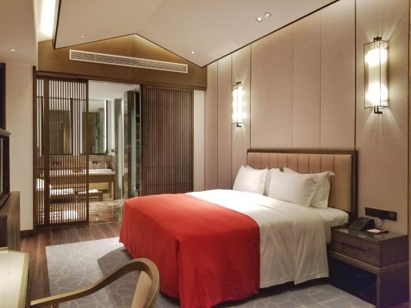 而酒店就位于国清寺南侧,赤城山脚下,步行可至天台山风景区和赤城山等景点,妥妥的景区酒店,非常方便。酒店占地面积有6000㎡的占地面积,但只有40间客房,而且做到了每一间房都是不一样的。套餐给的基础房型,但面积也有58平,已经是不少酒店套房的面积了。同款房型4月周末的日历房价已经要1862/晚了,套餐650/晚的价格,只有一个零头。