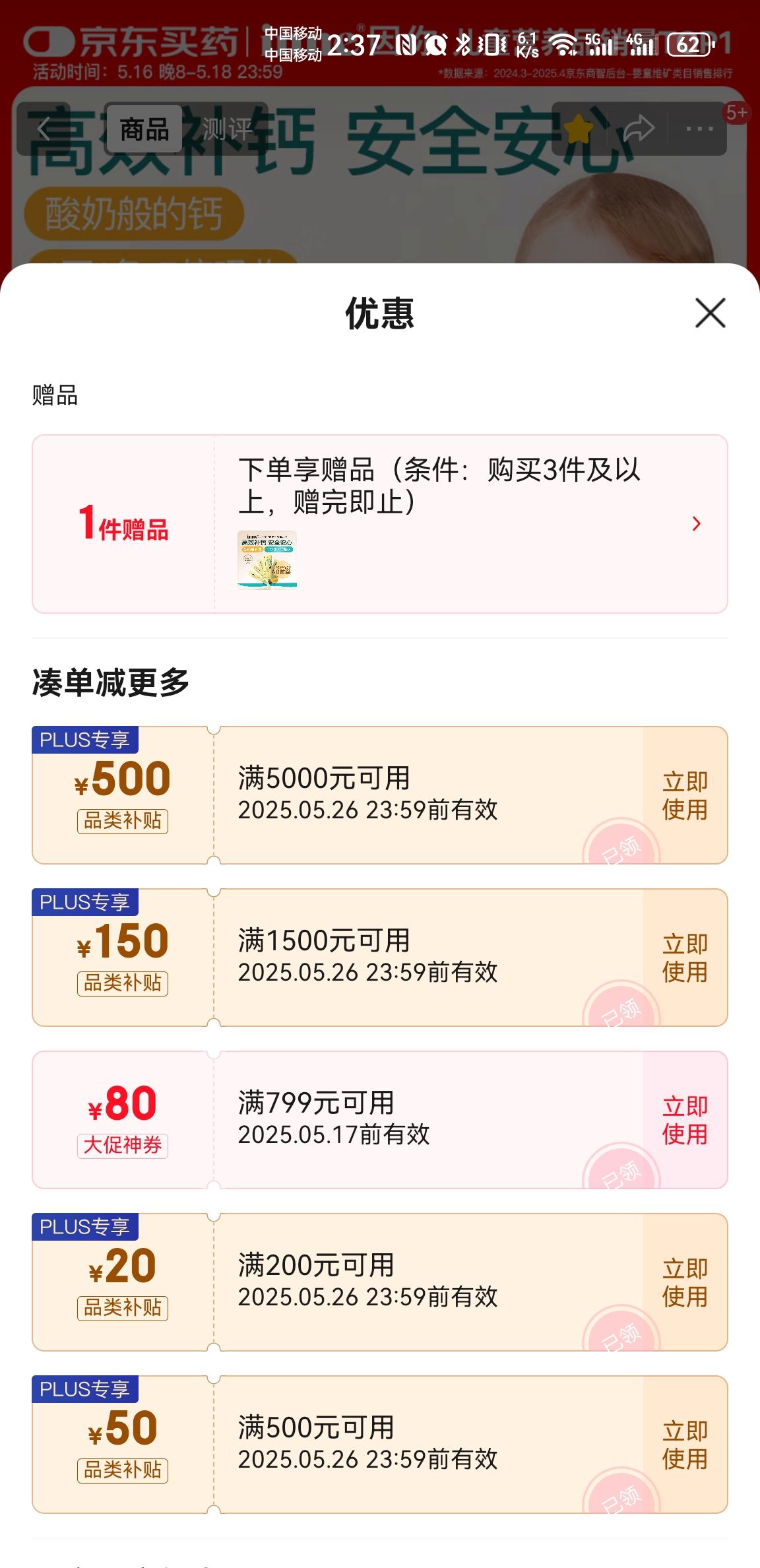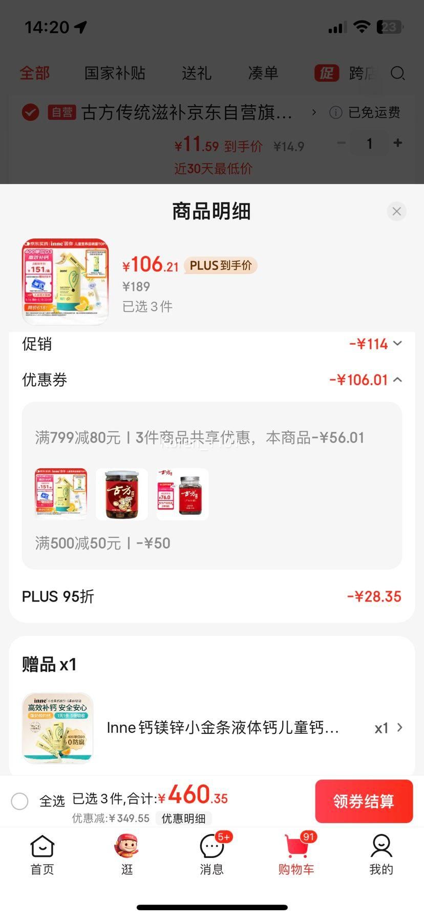 京东国际此款目前活动售价189元,参与799-80,500-50,满3件减114元优惠活动,下单3件,加购凑单品,主商品实付低至318.63元。