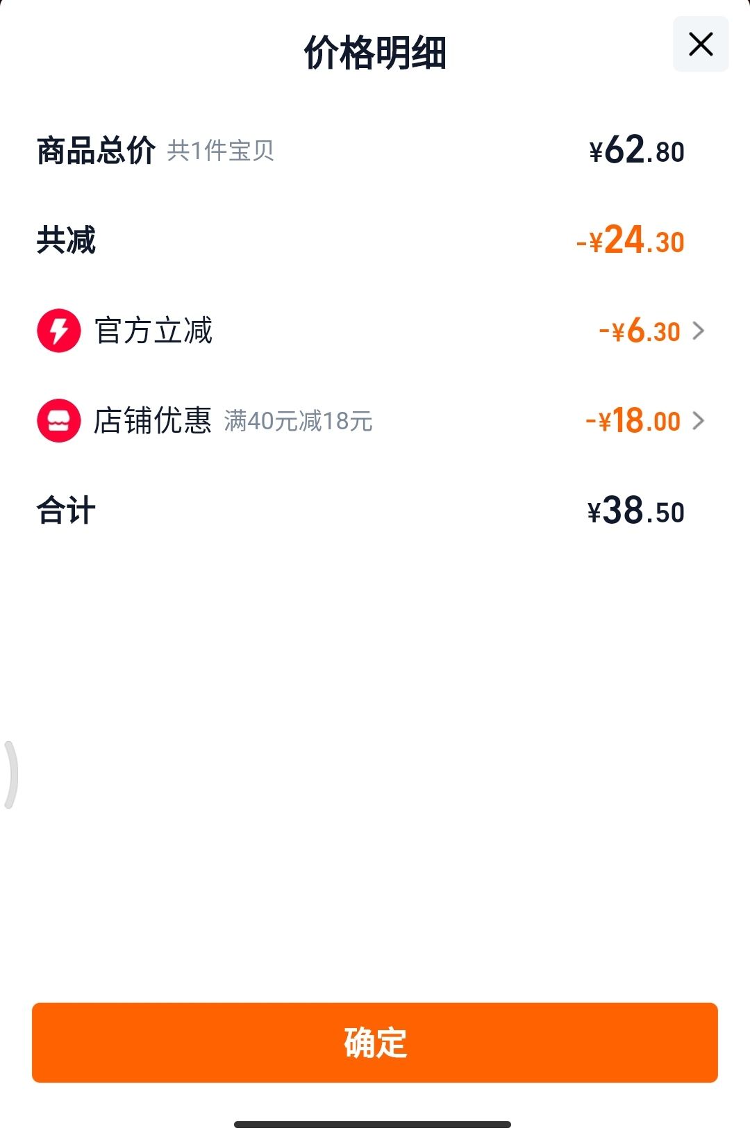 此款目前活动售价62.8元,下单领取满40减18元优惠券,参与立减6.3元优惠活动,下单1件,实付低至38.5元。