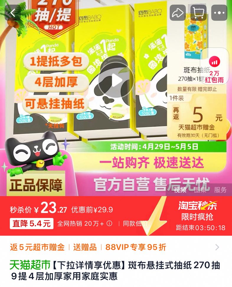 售价29.9元,立减5.4元,买1件返5元卡,下单1件,实付18.27元。秒杀「限时疯抢」下单,直达链接立减不对