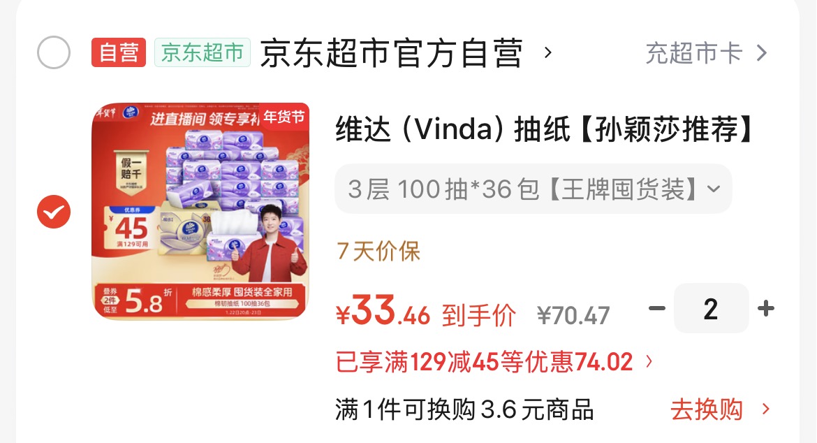 66.9🉐3层100抽*36包/箱*2箱,单包到手9毛!