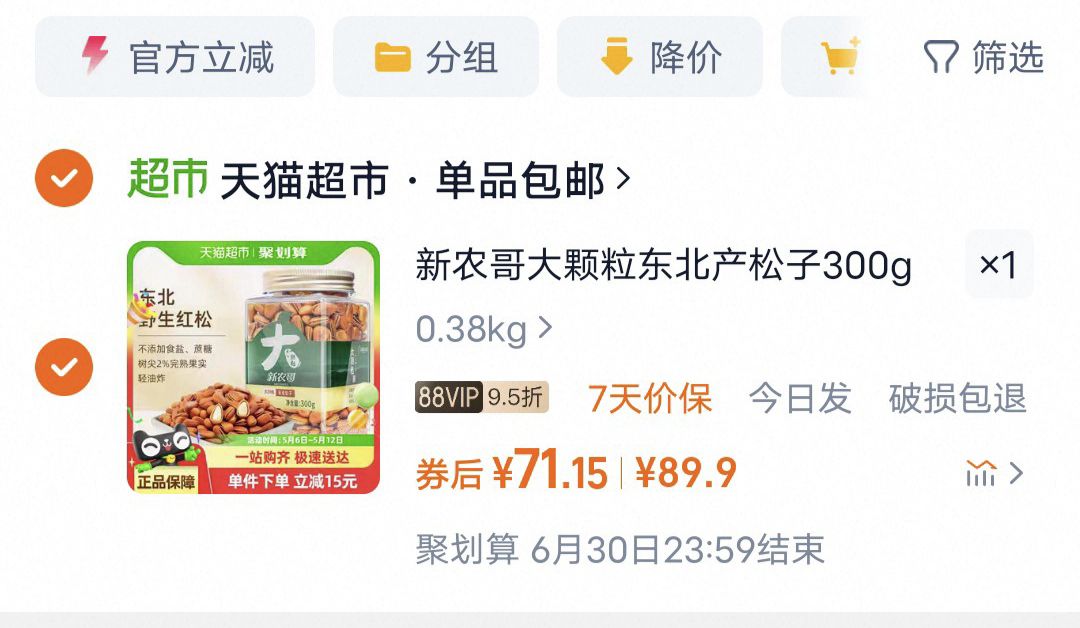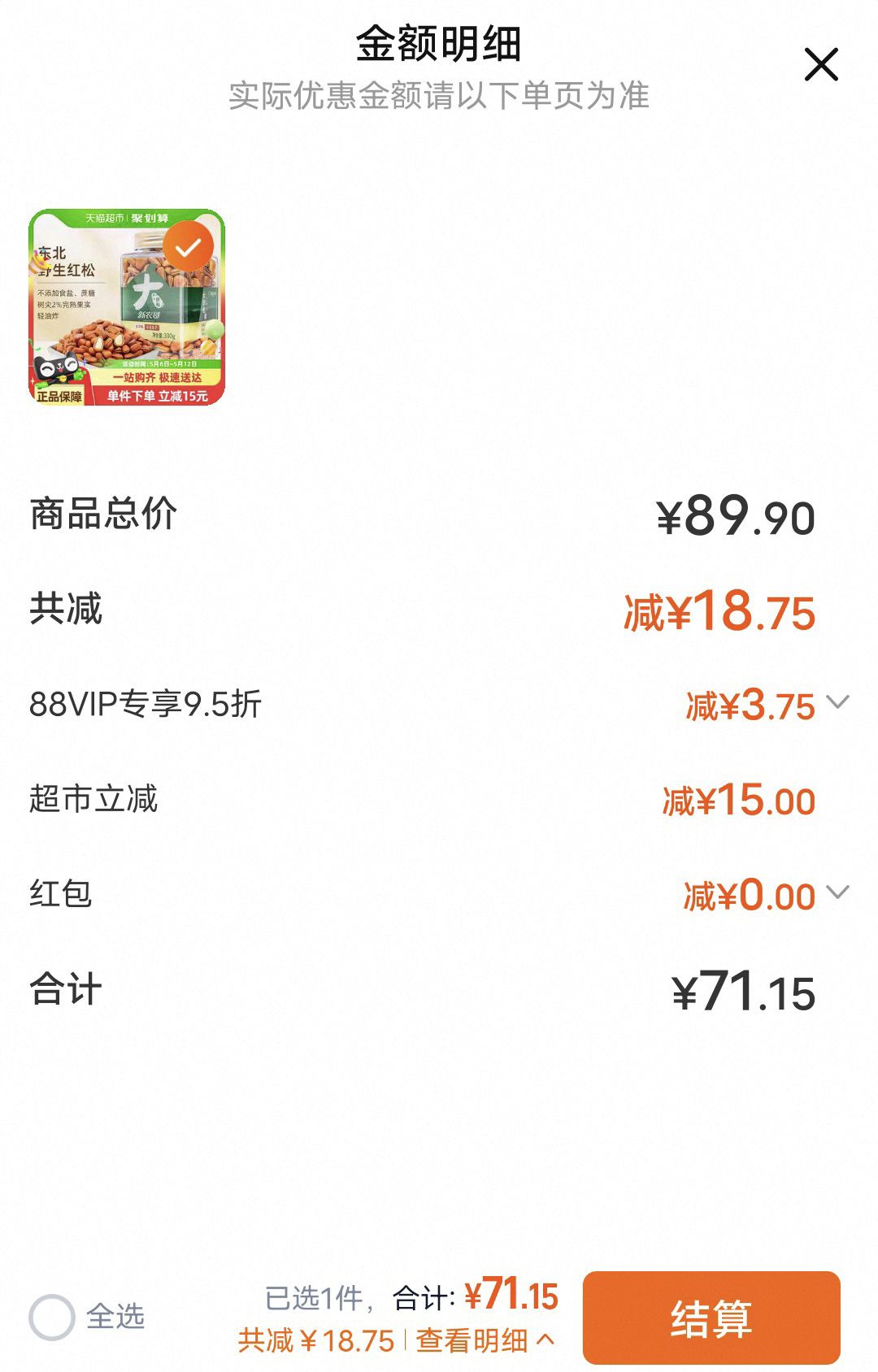 此款目前活动售价89.9元,参与立减15元优惠活动,下单1件,实付低至71.15元。