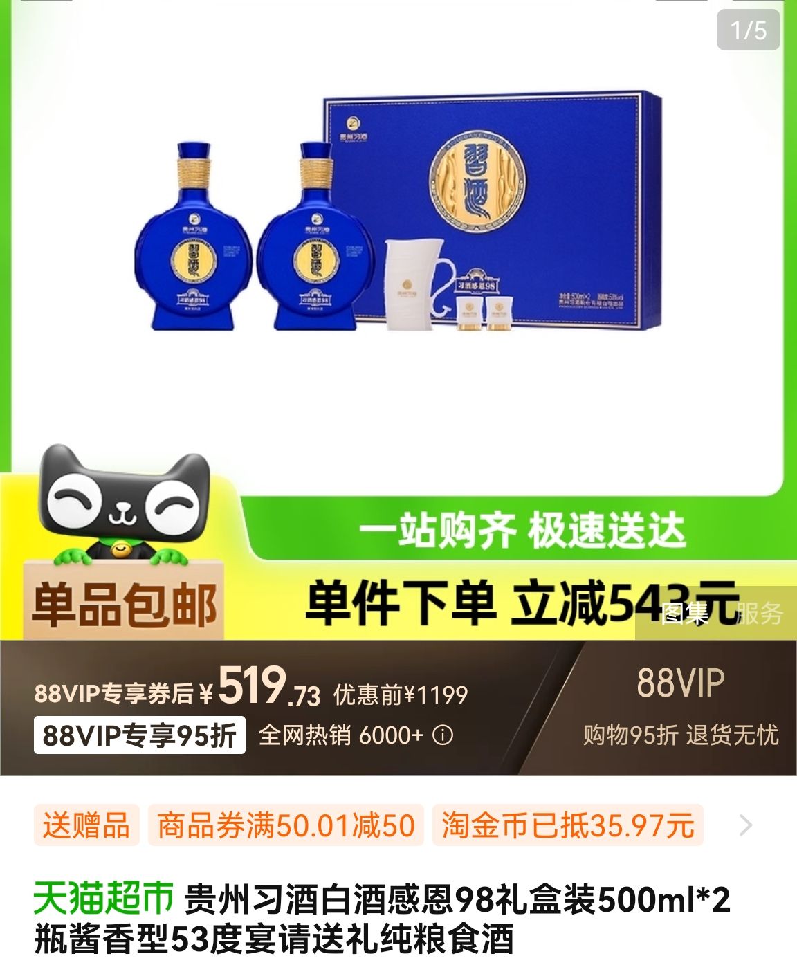 88VIP:习酒 感恩98礼盒 53%vol 酱香型 500ml*2瓶