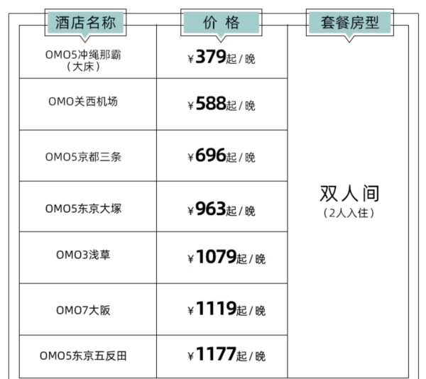 现有日本星野酒店OMO 大阪/东京/京都/冲绳等地 双人间1晚通兑,最低379元起/晚,最多可入住2成人。可入住日期为2025.4.26-2025.9.30,需提前30天预约。补差规则以产品页面为准,不约/约不上可退款。可选套餐有: