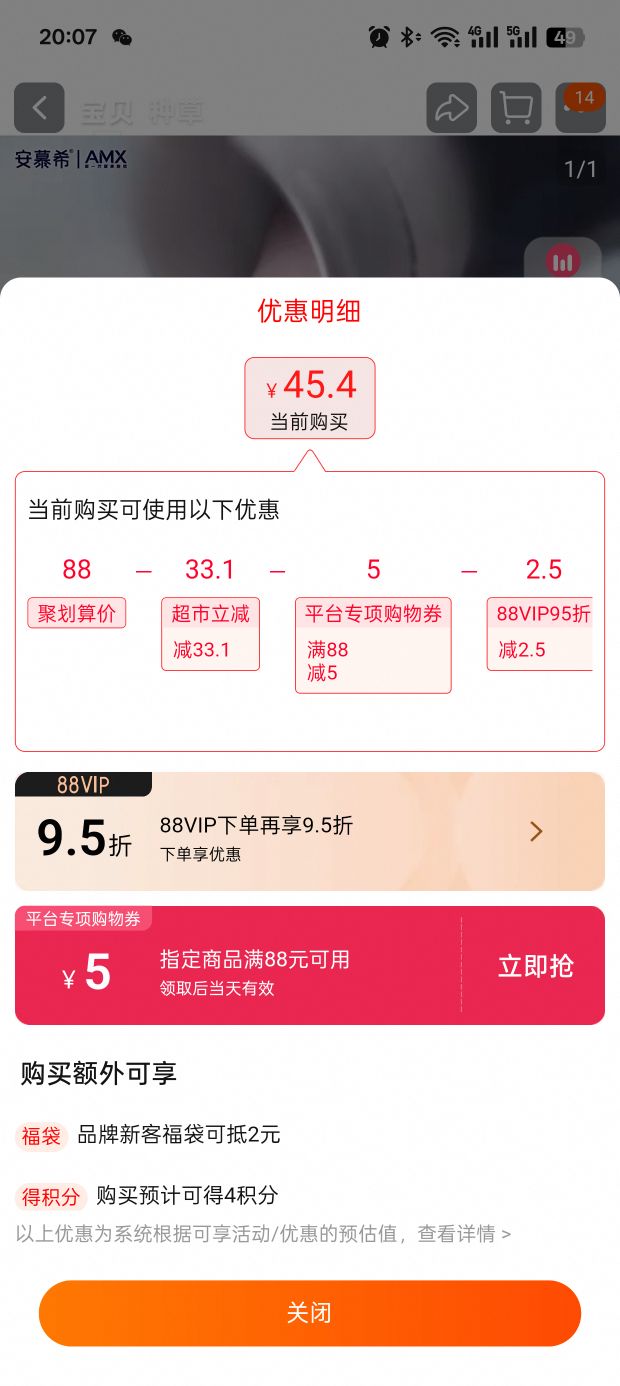 此款目前活动售价88元,参与满1件打9.5折,满88减5,立减33.1元优惠活动,下单1件,实付低至45.4元。