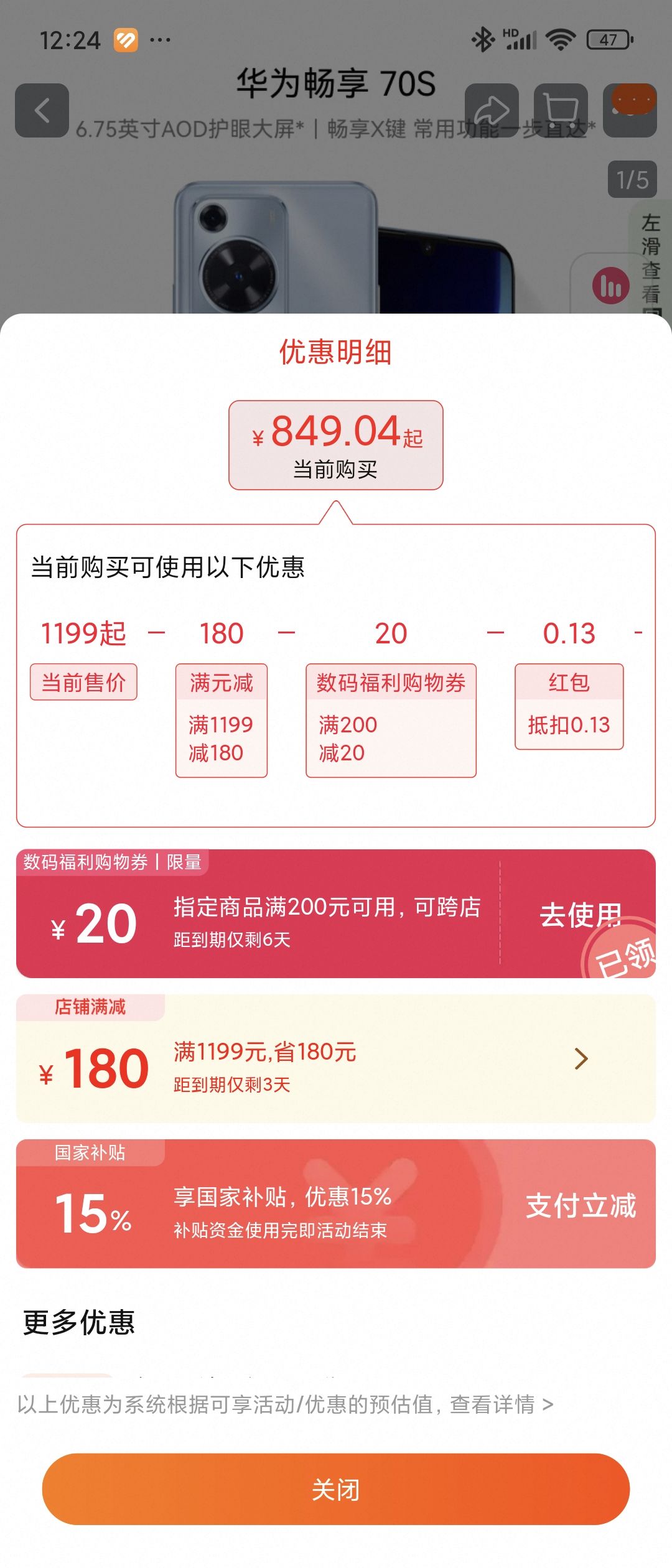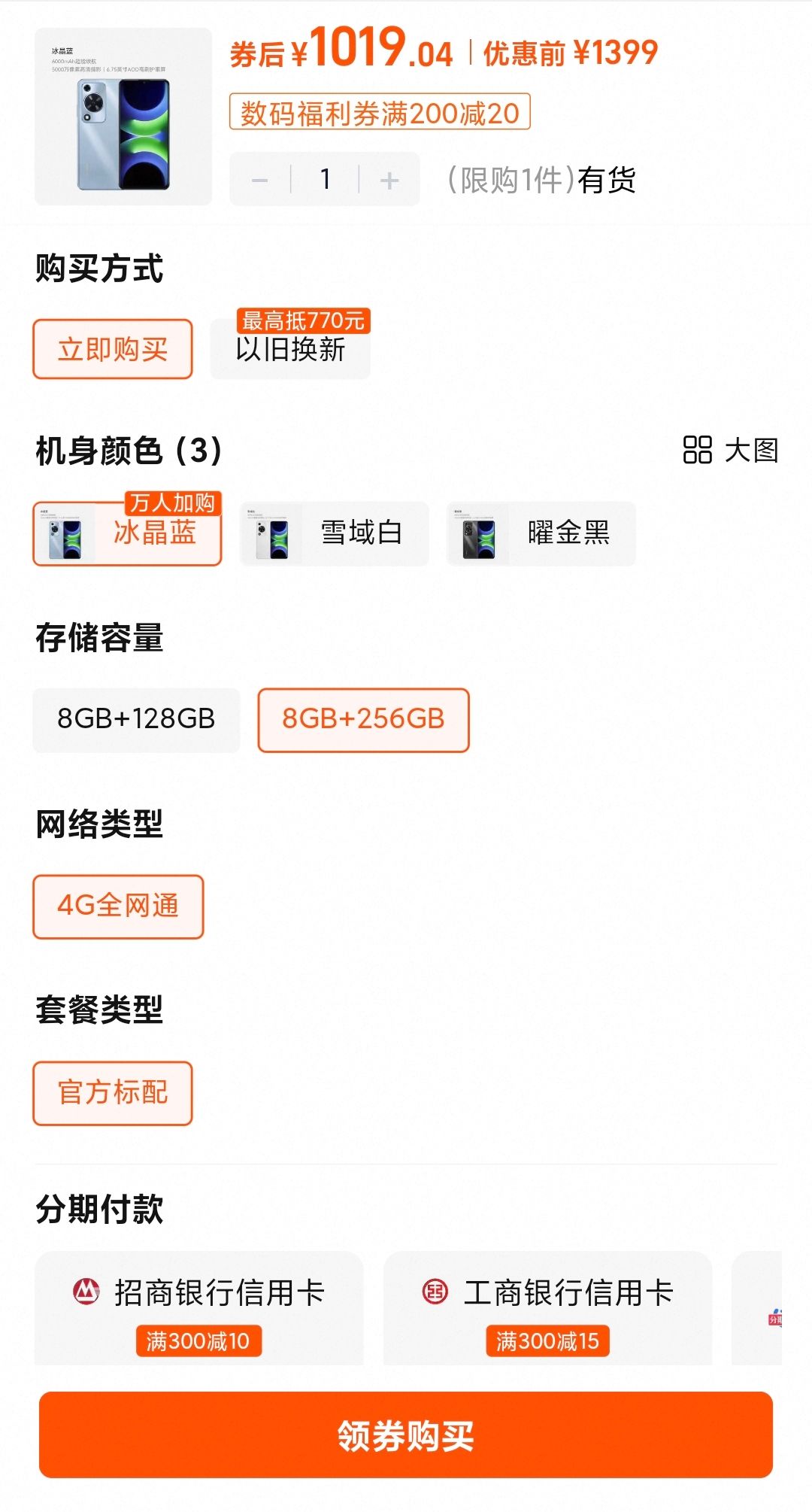 此款目前活动售价1399元,参与满1199元减180元,满200减20,国家补贴15%优惠活动,下单1件,实付低至1019.2元。