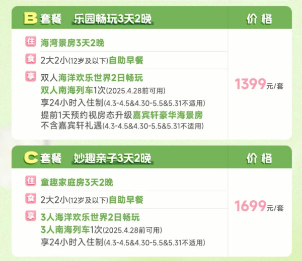 这次也有好几款套餐同时推出,从综合性价比来说,含门票的更划算。根据孩子年龄,如果家有1米以下儿童门票买B套餐最划算(1米以下是免票的)。1米以上要买门票就选那C套餐,不但房型做了升级,且三人套票更加划算。我们查了目前票价,算下来一个人光门票就要386元了,抛去门票就是历史低价!B套餐提前1天预约还能视房态升级为嘉宾轩豪华海景房,但是不带嘉宾轩,不过这价格也够可以的了。