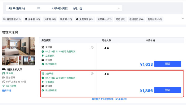 目前同款房型的周末日历房价格要1100+/晚,算下来是5折多点,还送了100元的餐饮额度,可以在酒店内的中餐厅使用。