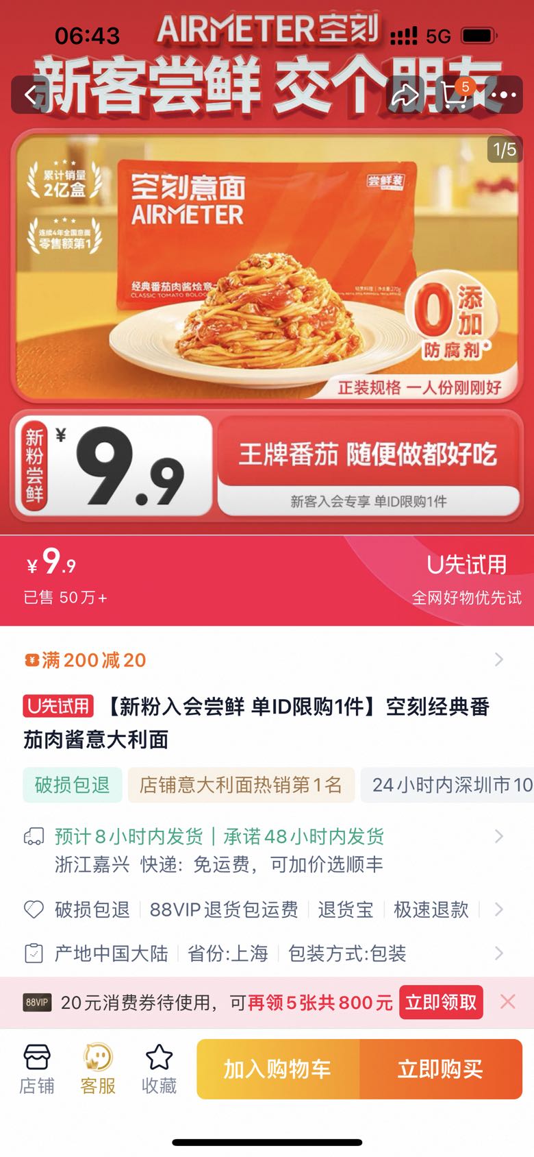 空刻 经典番茄肉酱烩意大利面 270g 新会员尝鲜装