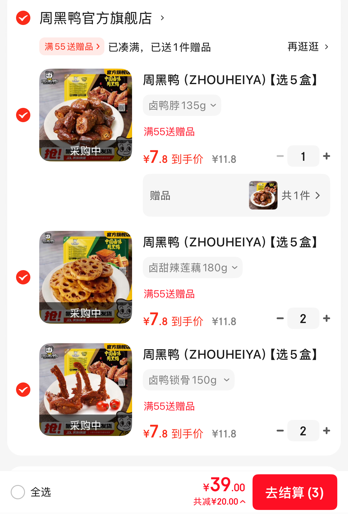 39到手6盒:任选5盒+赠1盒鸭脖共6盒