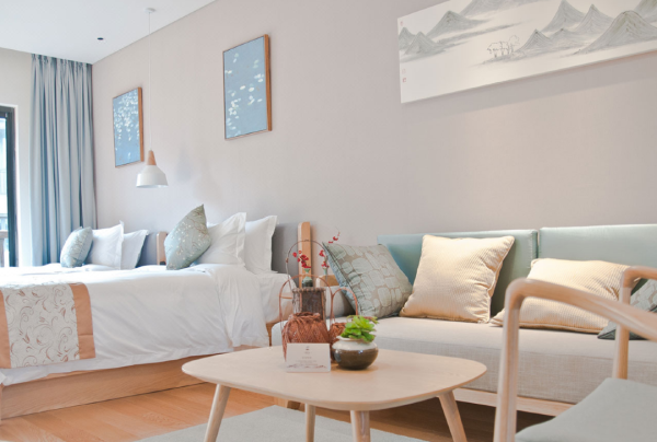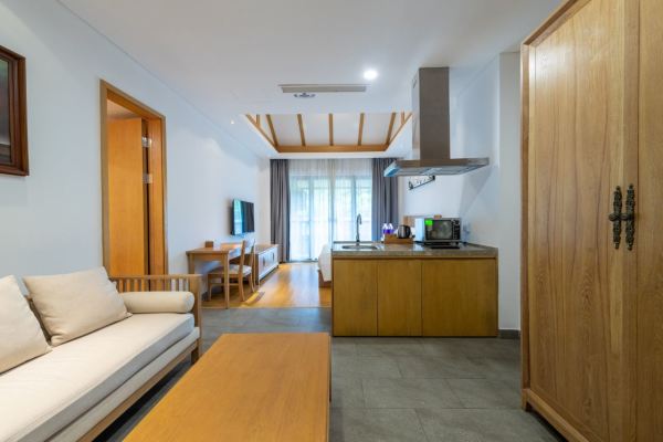 禅意村舍标准房,面积40㎡,有个简洁的洗煮、烹饪区域、沙发构成的起居区域,还挺实用的。