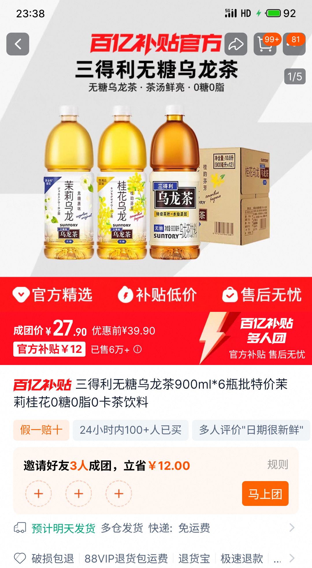 三得利 乌龙茶茉莉桂花900ml*6瓶