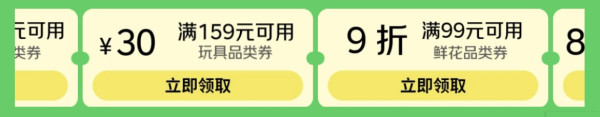 3月7日已更新:本周京东黑色星期五促销马上就要截止了,除了超值的超市黑五神券,还可领满99元打9折鲜花品类券、满159减30元的玩具品类券等品类券。明天就是3.8节了,想给妈妈、老婆或者自己买束花的们,赶紧把鲜花券领了!>点此领取
