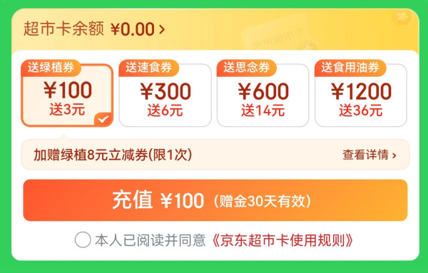🌟京东超市卡充值下单更优惠,首充送3元,复充最高赠120元!