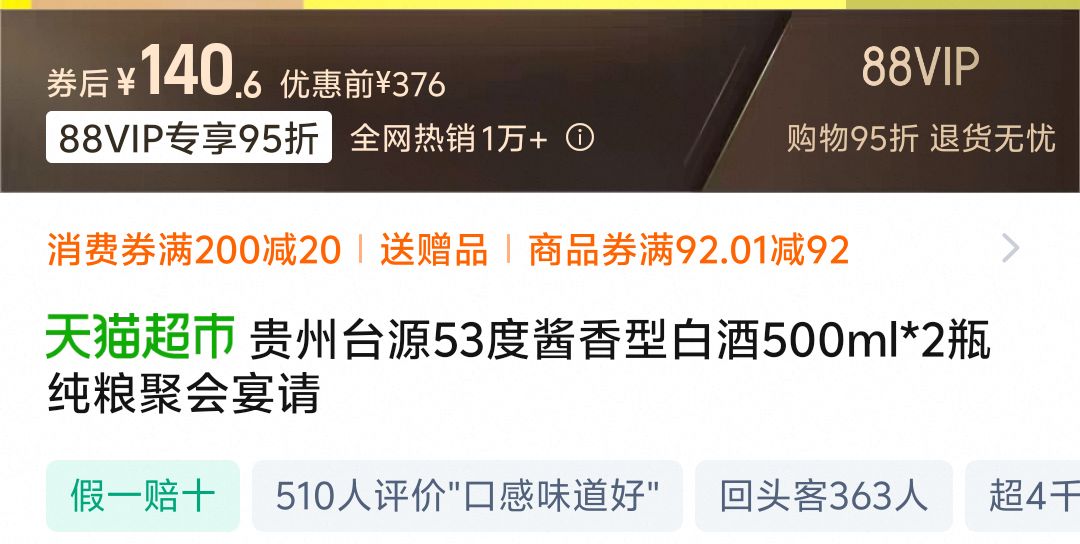 88VIP:台源 Taiyuan 53%vol 酱香型白酒 500ml*2瓶