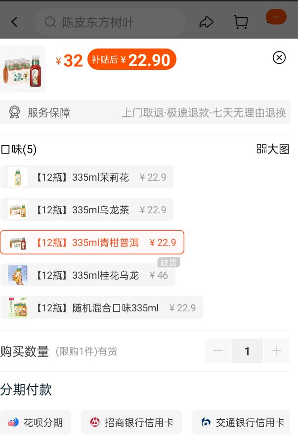 农夫山泉 NONGFU SPRING 东方树叶335ml*12瓶无糖茉莉花茶普洱桂花乌龙茶青柑普洱 多口味可选