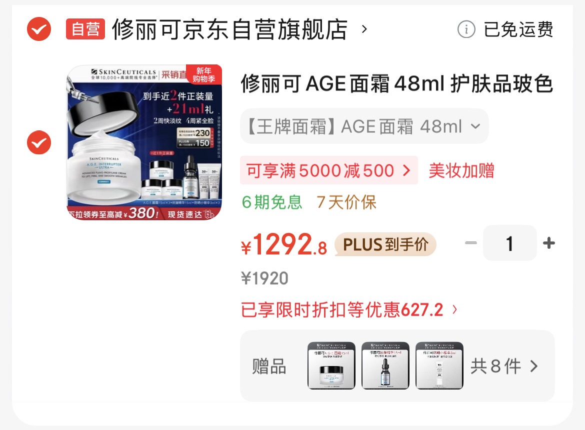 到手面霜48ml+15ml*3+抗皱精华15ml+防晒6ml