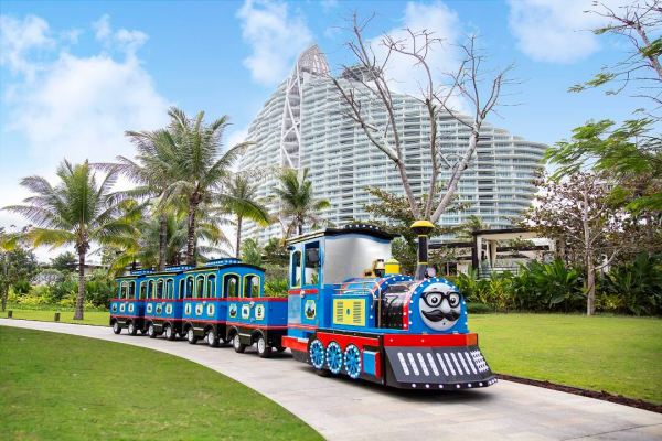 回来说说酒店。海棠湾亲子酒店是清单里的老熟人了,地处海棠湾的中心位置,距离亚特仅5分钟,酒店建筑设计与迪拜帆船酒店一脉相承,146米高主楼,远观犹如巨大风帆,特别亮眼。酒店园区面积很大,穿过椰林绿草就是沙滩大海,随手拍拍都很出片儿。酒店亮点很鲜明: