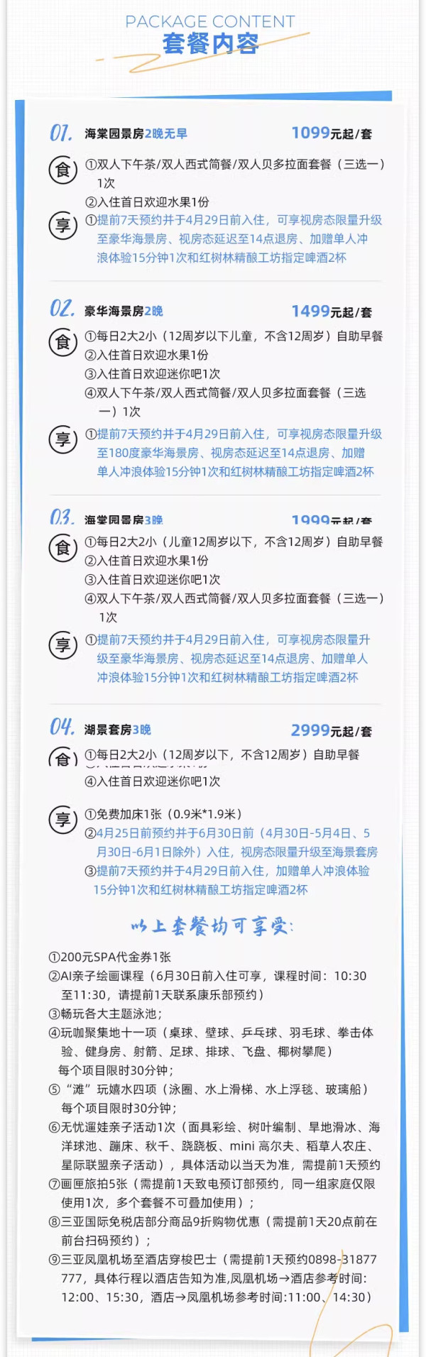 重点看1999元/3晚海棠园景房和2999元/3晚湖景套房套餐。1999元档平均下来666元左右/晚,给的园景房,面积有68平呢,比有的套房都大了!这个房型非暑假的日历房价都要949元/晚呢,等暑假只会更贵,值得囤!